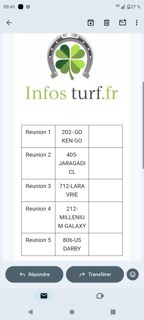 Exemple des pronostics envoyés la veille par mail ,à partir de 19 heures et plus tard 22 heures